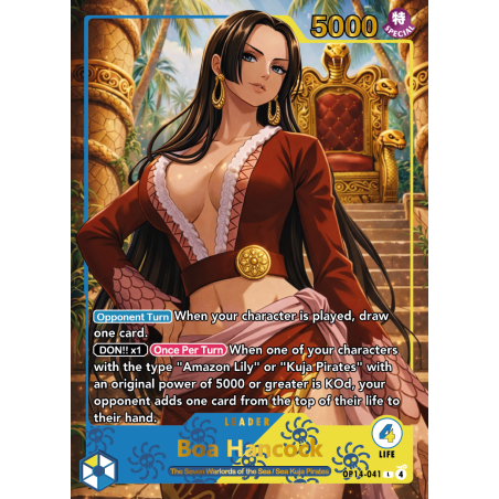 Découvrez la carte Leader One Piece Boa OP14, proxy personnalisée avec dorure premium et visuels anglais.