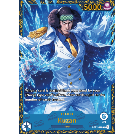 Découvrez la carte Leader One Piece Kuzan OP12, proxy personnalisée avec dorure premium et visuels anglais.